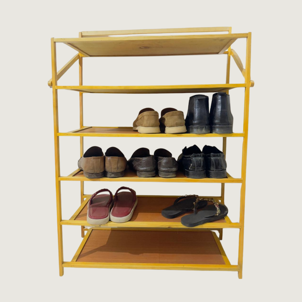 Keep your footwear collection neatly organised with this sturdy and vibrant 6-Tier Metal Shoe Rack. Built with a bold yellow powder-coated steel frame and smooth wooden shelf boards, this rack combines practicality with a cheerful aesthetic that brightens up any entryway, bedroom, or hallway. Its open-shelf design allows for easy access and quick visibility of all your shoes, eliminating the daily struggle of searching through cluttered floors or boxes. Whether you are storing flat sandals, heels, sneakers, or loafers, this rack offers generous space across all six levels to accommodate the whole family’s footwear needs. The angled shelves are designed to make placement and retrieval effortless while maintaining a tidy, organised appearance at all times. Compact yet spacious, this shoe rack is ideal for apartments, homes, hostels, and even small retail displays.